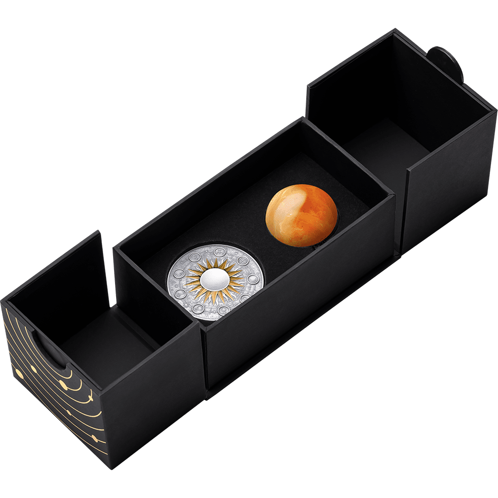 Každá sada exkluzivních mincí je dodávána v elegantním boxu s vyobrazením oběžné dráhy planet. Emisní náklad je celosvětově limitován na 500 kusů pro celý svět!