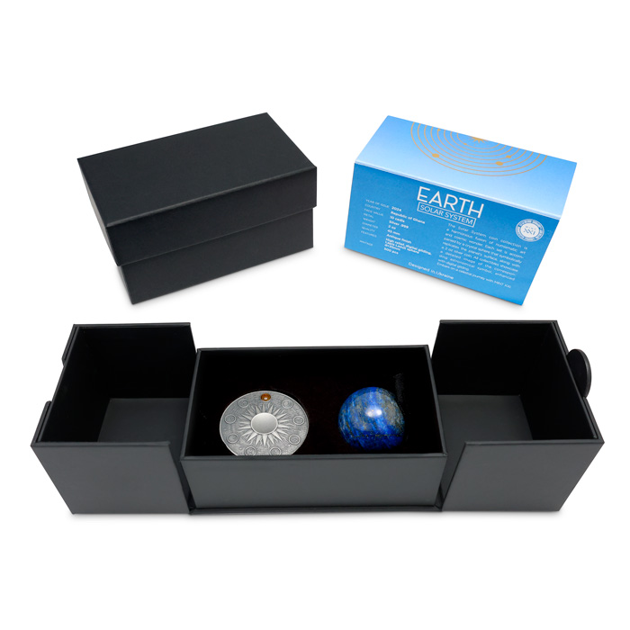 Stříbrná mince s koulí z Lapis Lazuli je vydaná Ghanskou republikou pro rok 2024 a ražená z nejčistšího 99,9% stříbra o váze 2 Oz (62,2 g) v precizním provedení Antique. Série Solar systém nabízí v originálních zmenšených modelech planety Sluneční soustavy. Druhá mince série zobrazuje třetí planetu, Zemi.